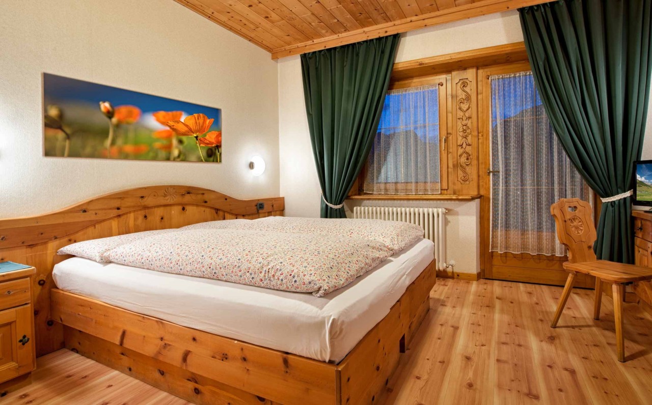 La camera matrimoniale è molto luminosa, e l'ampio balcone panoramico con vista mozzafiato su Livigno vi sorprenderà, riempiendovi gli occhi di meraviglia. È l’ideale per coloro che vogliono vivere una vacanza romantica e semplicemente indimenticabile. É arredata con pavimenti in parquet e mobili e soffitto in legno, rifiniti nei minimi particolari. La stanza è dotata di ogni comfort, non vogliamo che vi manchi nulla durante la vostra vacanza.